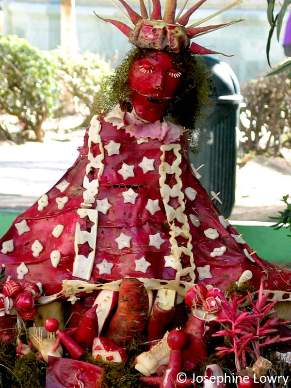 On December 23rd, artists and farmers gather in the zocalo (town square) and create ornate sculptures out of radishes. The sculptures range from a giant Jesus on the cross to the Procession of the Rosary, from graveyard picnic scenes to amusement parks with radish swings. The creative use of what I consider highly unappetizing root vegetables is nothing short of awe-inspiring. Plus, when you factor in my unbridled love of the color red, I was in heaven. A heaven reigned over by a radish-based Virgen de la Soledad!