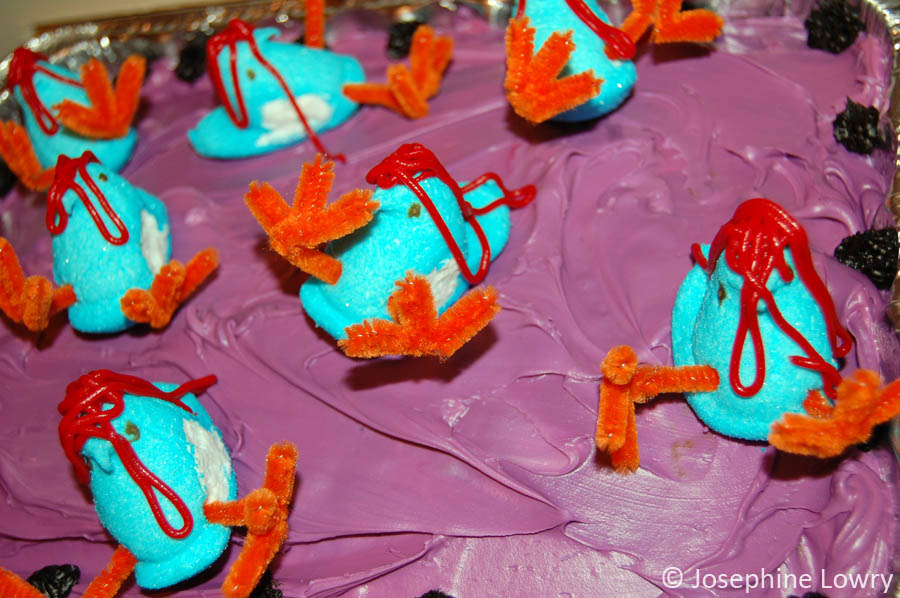 Unlike chocolate and peanut butter, my affinity for the color red and Easter Peeps may not be the perfect combination. And when you factor in the ritual of biting the ears off chocolate bunnies, well, let’s just say that my springtime creations might not be something you’d bring to brunch at Grandma’s house. When I think of Easter, I think of knife-welding marshmallow peep bunnies, don’t you? Take for example the recent cancellation of the Easter egg hunt due to aggressive helicopter parents. All that sugar and competition is a recipe for disaster and mayhem.