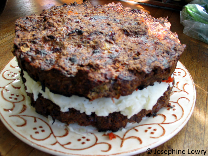 Another important bit of advice while frosting your meat cake: don’t apply too much! If you do, the potatoes may slide down the side and your masterpiece will resemble ketchupalanche. Luckily, my dinner guests were kind enough to overlook my mistake. Perhaps this is because they didn’t want me to create meatloaf replicas of them in the future.