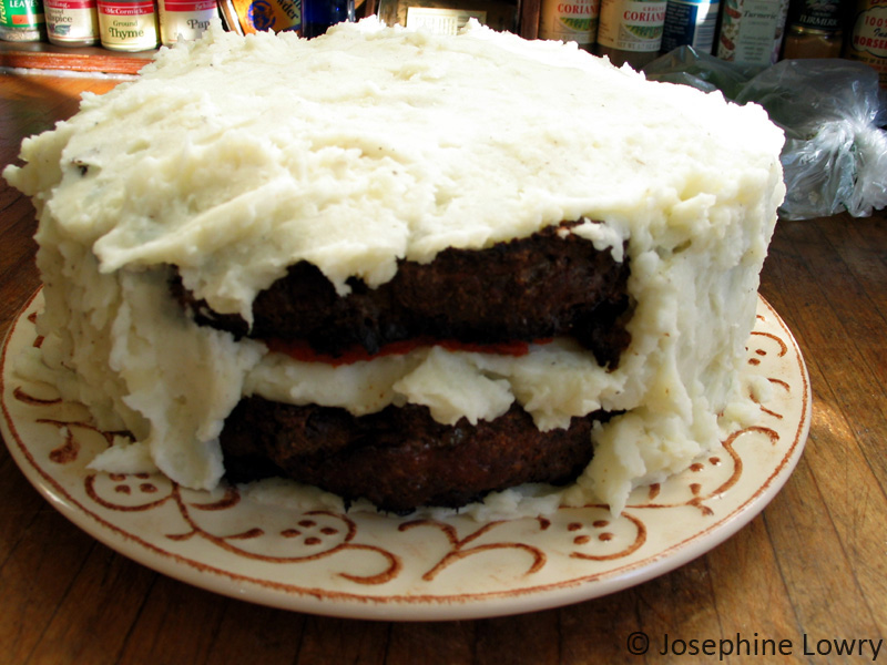 Now that your meat has been stacked, you’re ready to apply the mashed potato frosting. I recommend tepid potatoes as they seem to spread a bit more easily than if they were hot or cold. I apply them the same way that I do regular frosting using a regular silverware knife. As you’re applying the frosting, spread it as evenly as possible while avoiding spreading the tomato paste in the middle around. The goal is meat cake, not bloody meat cake (that can be a future project!).