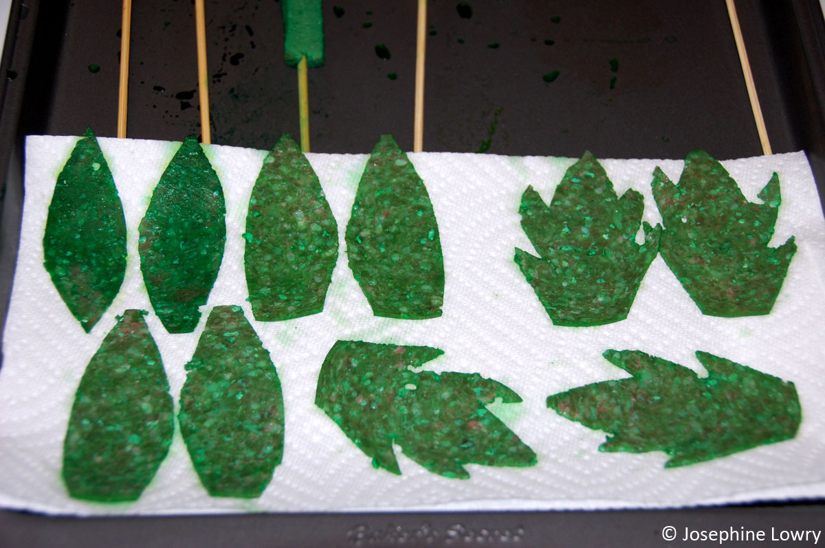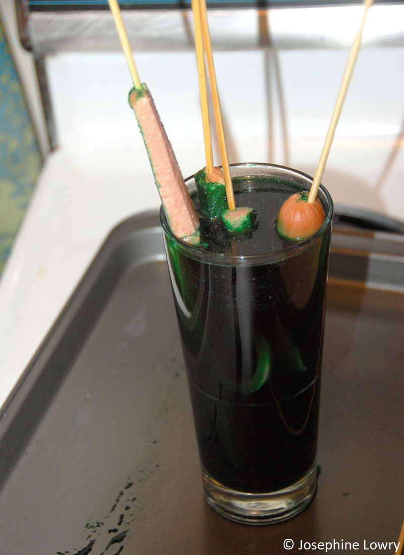 Not one to be easily deterred, I filled a pint glass with green food coloring and water. This approach worked well for the salami leaves [ed note: the meat and the fat pieces that make up salami become unappetizing when colored green], but the concentration of dye wasn’t enough to color the hot dogs as vibrantly as I wanted. In the end, I put the hot dogs stems on the tray and poured food coloring all of them before rubbing it all over them. Sadly, my palms were as green as the hot dogs, but this allowed me to truthfully state that I’d been giving handjobs to leprechauns.