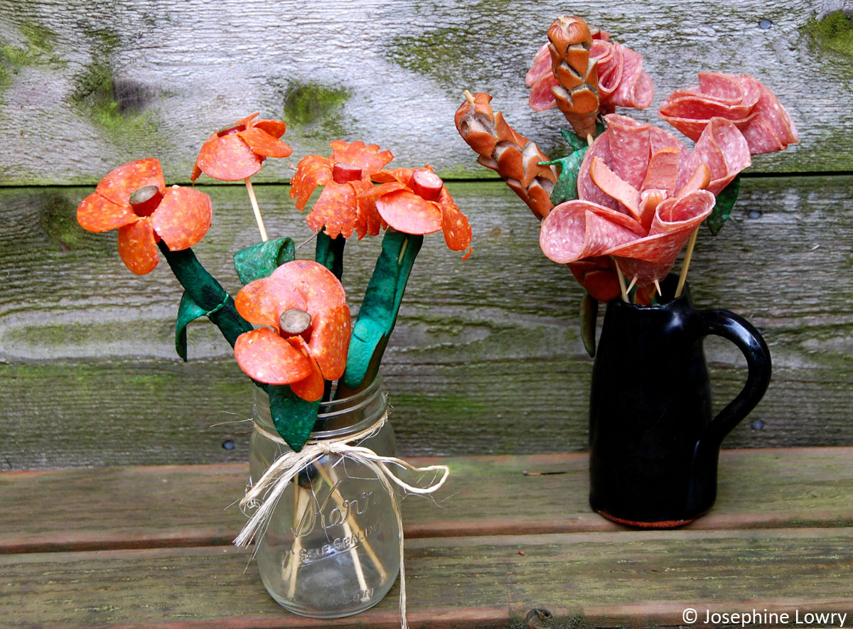 The allure of flowers is well-documented in poetry, prose, art, and in my own creative pursuits. And so, it should come as no surprise that I would combine my passion for food art with floral design. Factor in a bit of food coloring, a Seattle Juneary afternoon, and a pile of processed meat and you end up with meat bouquets. And interesting enough, I just realized that I’ve been waiting my entire life to use “meat bouquet” in a sentence.