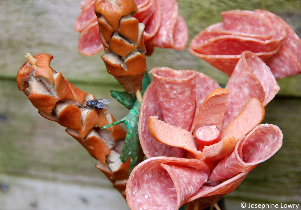 Overall, the process was both tedious and gross. And as someone who loves salami and pepperoni, it’s going to be a long, long while before I crave an Italian sub or a pepperoni pizza. But artistically, the results far exceeded my expectations. And when a fly landed on the meat petals, I was thrilled. Grossed out, but definitely thrilled. MEAT PETALS! ;