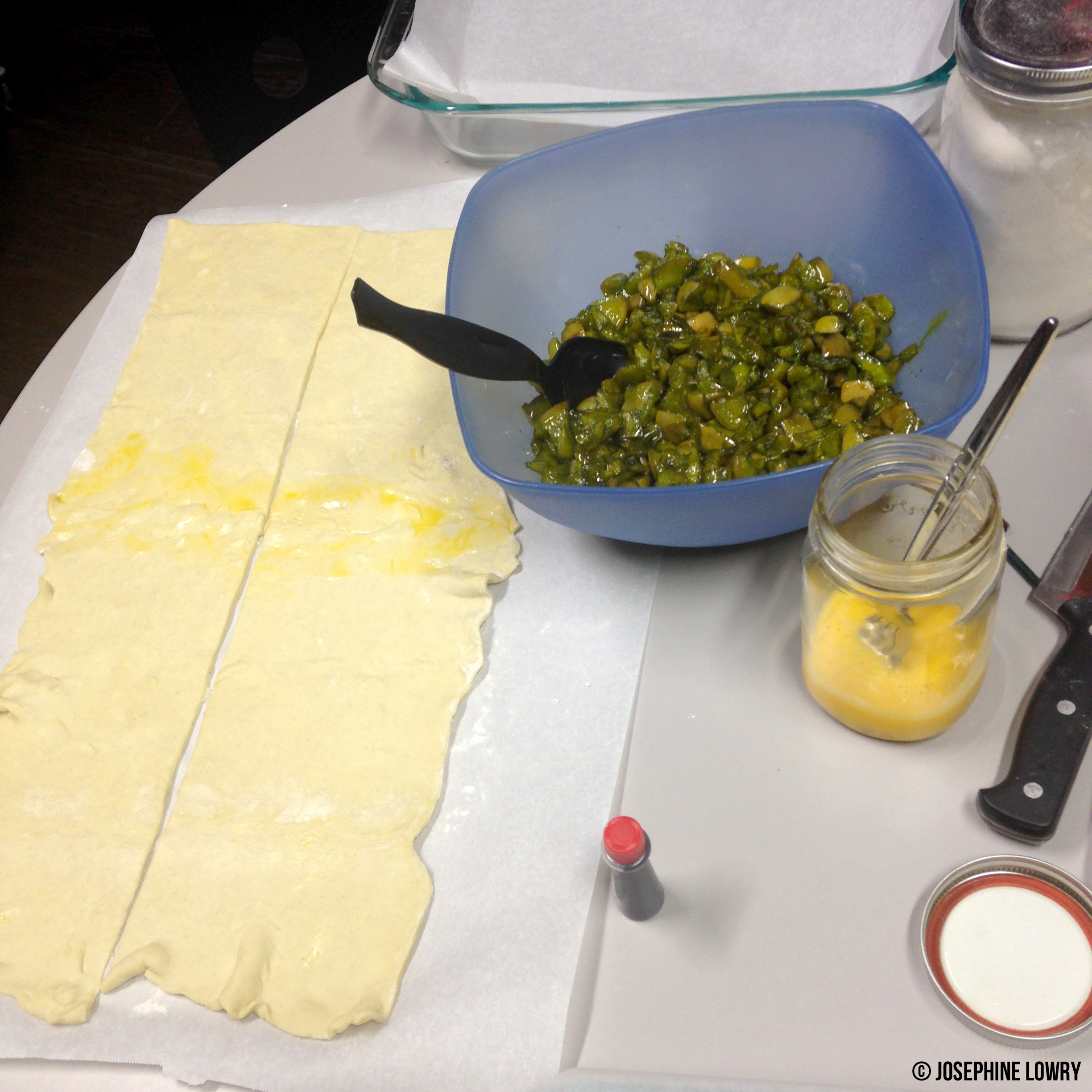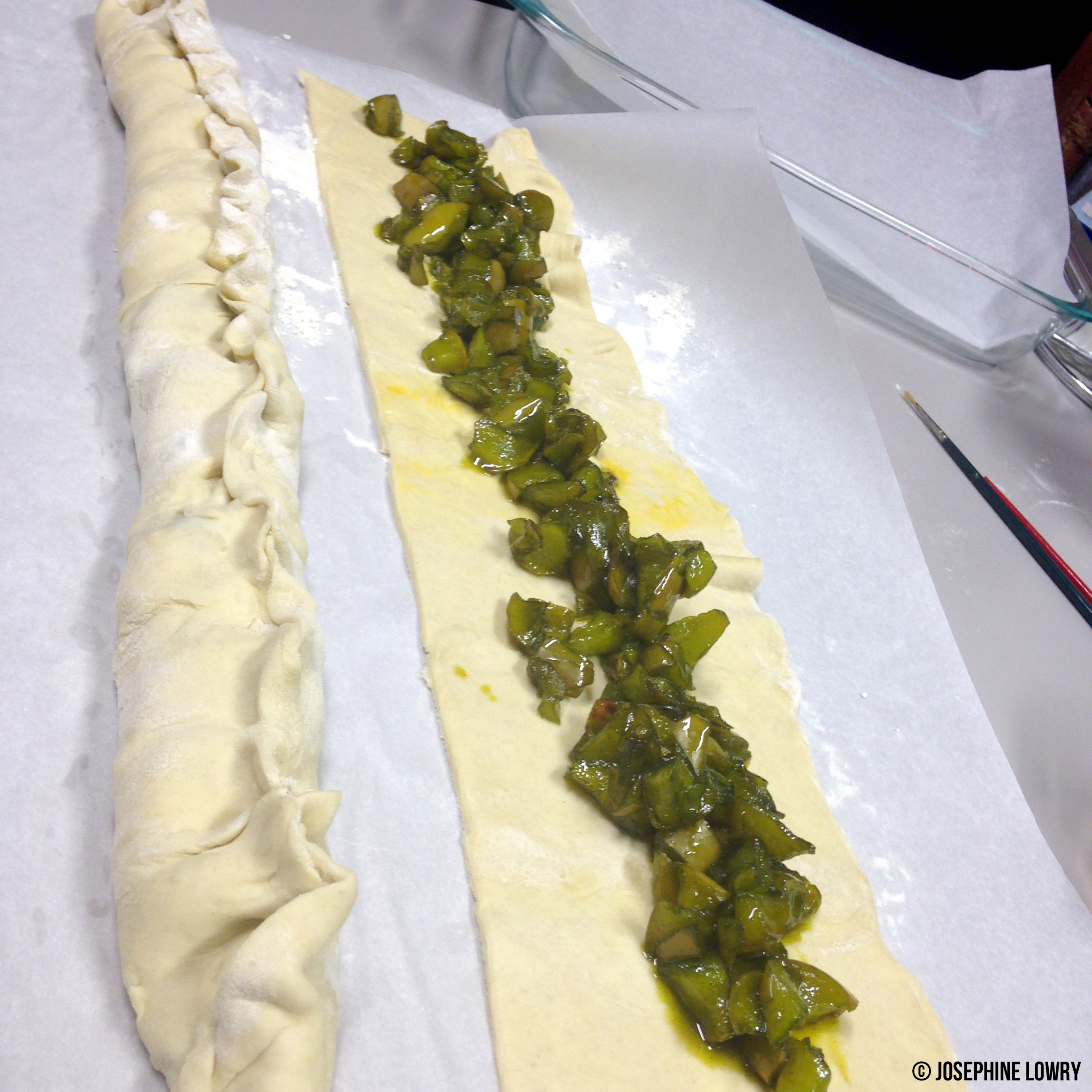Then following the instructions in the puff pastry intestines recipe (see link above), I formed long strips of pastry, filled with the “tastes much better than it looks” cooked cinnamon apple mixture and doctored the sides together to form a nice seal. The green syrupy goodness from the cooked apples leaked out once cooked, so I recommend going full on med school to ensure your intestines are properly sealed so they don’t leak.