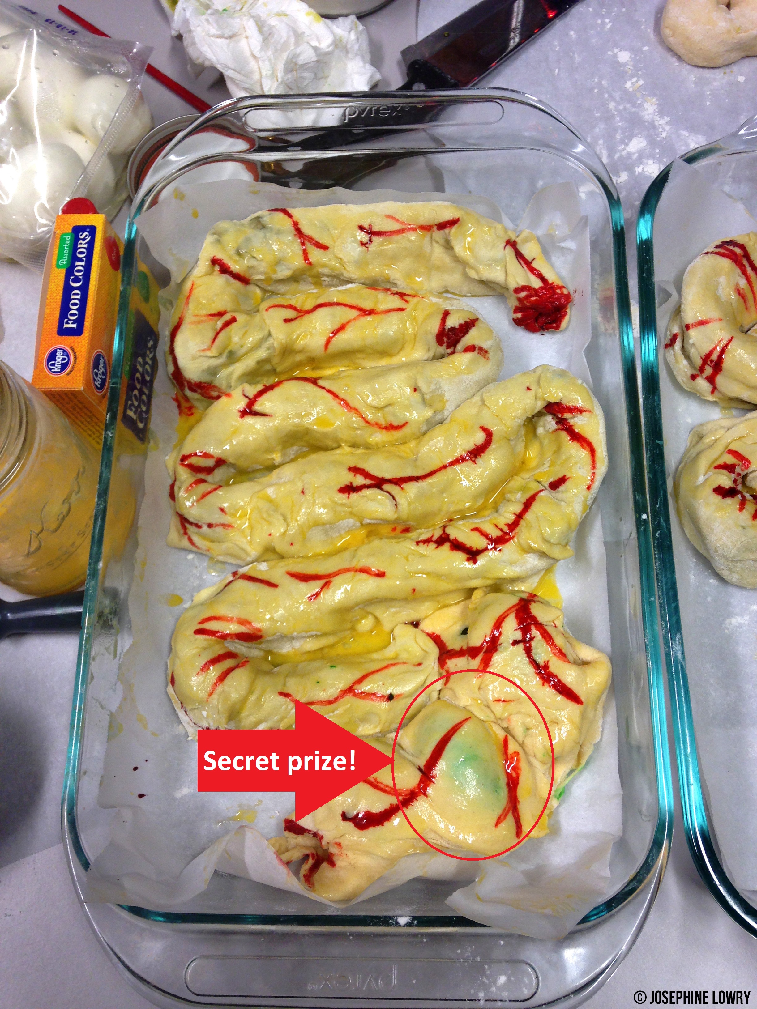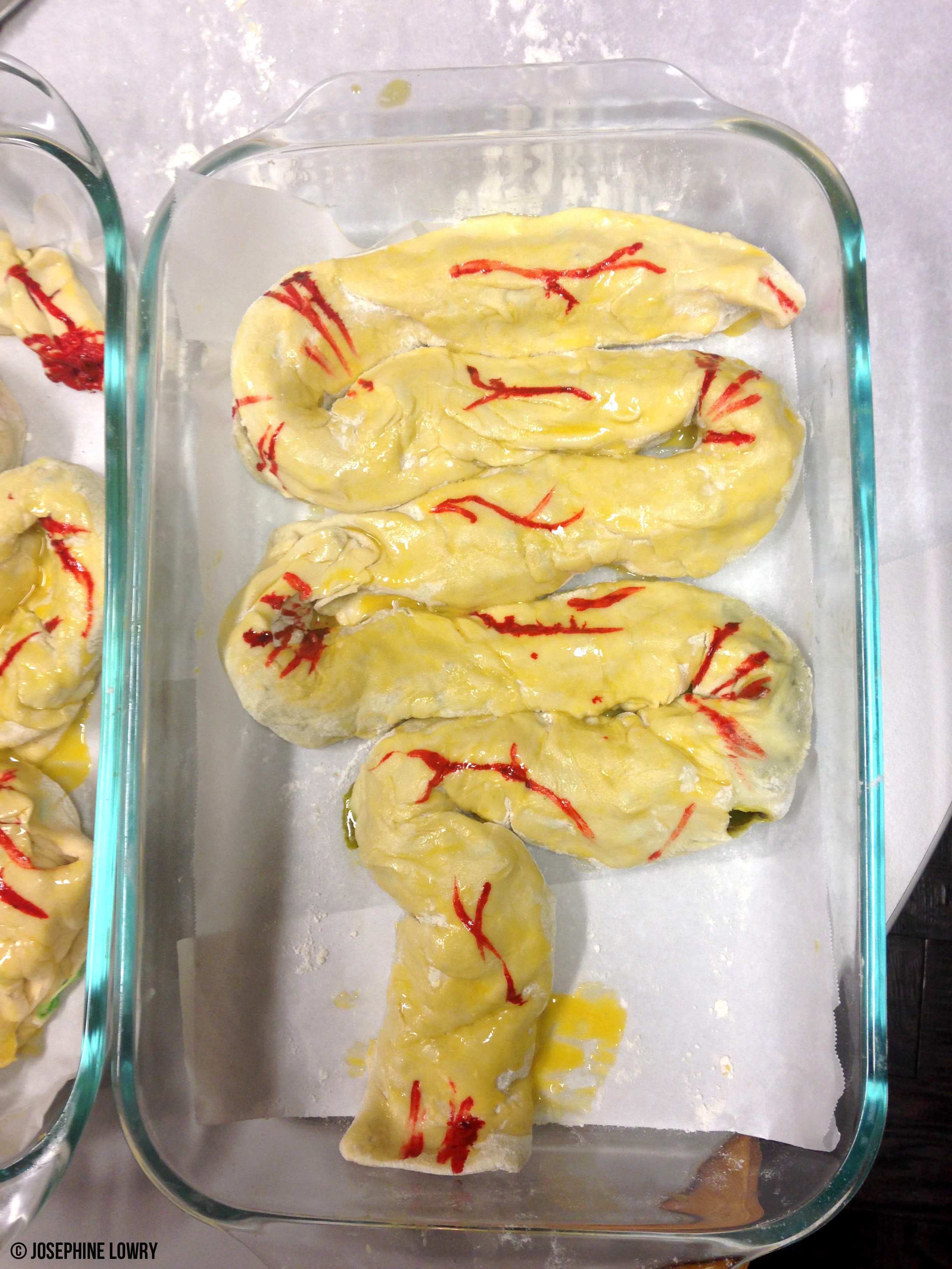 After basting the formed puff pastry with egg, I carefully painted red food coloring-based veins along the length of the intestines. I like to think it gives them a bit of added chutzpah!