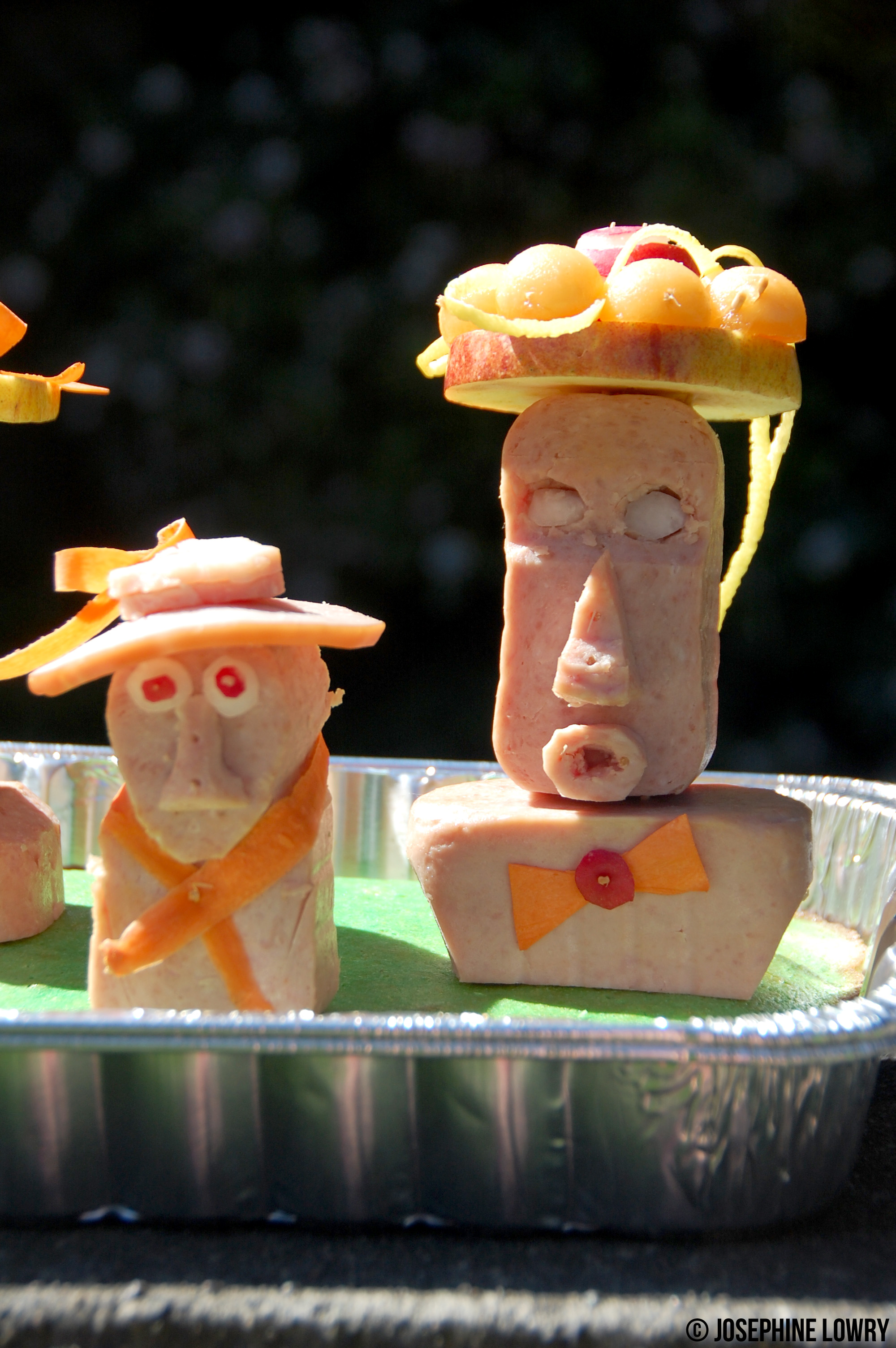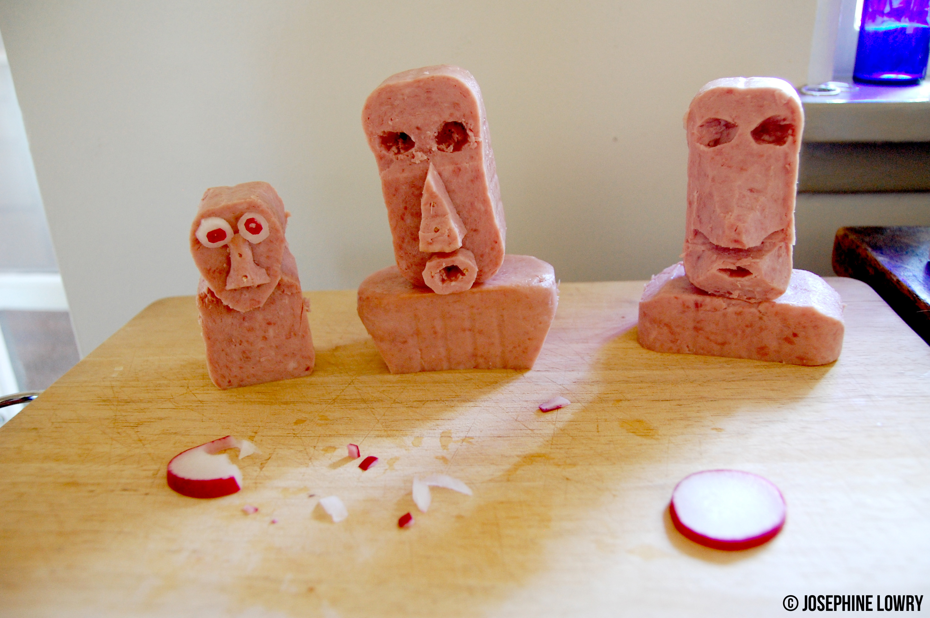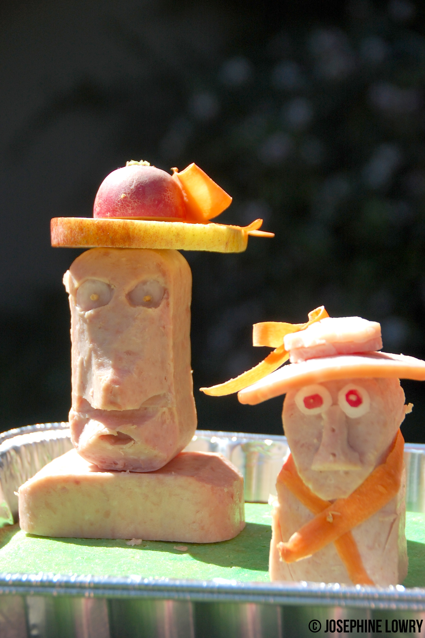 Easter Island headsFor their eyes, I used radishes. Their hat brims were made from sliced potatoes and/or ham as it’s important to maintain the traditional Easter dinner ingredients.